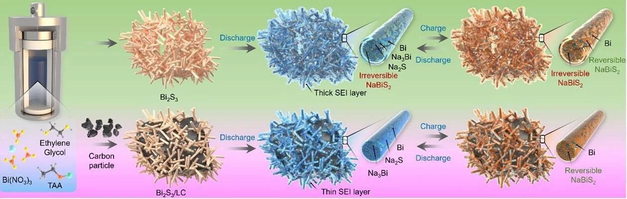 Bi2S3是一种极具潜力的钠离子电池负极材料,因其具备高比容量和优异的成本效益而受到广泛关注。然而,在充放电循环过程中伴随的显著体积膨胀现象,导致材料出现循环稳定性差与首次库仑效率低等问题,严重制约了其在实际应用中的进一步发展。本研究采用溶剂热法将Bi2S3纳米棒负载于褐煤衍生的碳骨架上,成功制备出一种高性能的阳极材料(Bi2S3/LC)。实验研究与理论计算相结合,表明LC的存在可有效提高Bi2S3的孔隙率及硫空位浓度,从而增强其钠化中间产物NaBiS2对Na+的吸附能力与电化学可逆性。此外,在酯基电解质中添加氟乙烯碳酸酯(FEC)可促进负极表面原位生成均匀且超薄的富NaF固体电解质膜,并有效提升其结构稳定性,进而提升Bi2S3负极的首次库仑效率和循环稳定性。