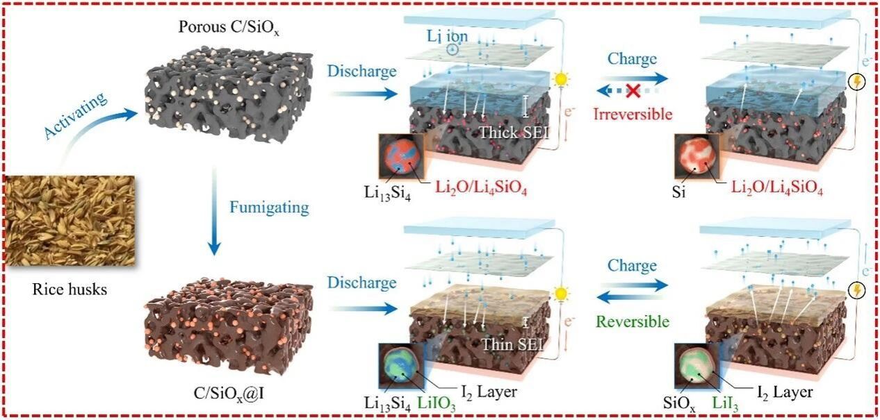 具有更高容量和更低锂化电位的C/SiOx负极已被认为是下一代可替代石墨用作高能量密度锂电池的负极材料。然而,C/SiOx存在首次库仑效率低的问题,极大地阻碍了其实际应用。在本研究中,我们报道了一种简单的碘氧化还原反应策略,以实现高容量C/SiOx负极在长寿命锂电池中高度可逆的锂存储行为,并显著提高其首次库仑效率。具体而言,通过简单的熏蒸将I2引入多孔C/SiOx中,合成其复合物(C/SiOx@I),其中I2能够通过氧化还原反应有效地抑制SiOx的不可逆锂化反应。此外,LiI3和LiIO3作为氧化还原反应中间产物能够抑制电解质和LiPF6的分解,从而减少固体电解质膜的厚度,显著提升C/SiOx首次库仑效率和循环稳定性。这项研究为开发高首次库仑效率SiOx基负极材料以用于高能量密度锂电池开辟了一条新途径。