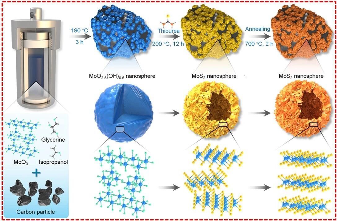 二维层状材料二硫化钼(MoS2)具有独特的“钼-硫-钼”三明治结构,层间距较大,因而被视为一种极具潜力的钠离子存储应用负极材料。然而,由于其固有的导电性较低、体积膨胀显著以及颗粒严重团聚等问题,限制其实际应用。本研究提出了一种新型的两步溶剂热合成方法,可在无需任何模板的条件下,成功制备由超薄纳米片自组装形成的、均匀且紧密负载于褐煤基碳载体上的二硫化钼空心纳米球(MoS2/C)。这些超薄纳米片组装成的空心结构不仅缓解了MoS2在充放电循环过程中的体积变化,还促进了Na+的扩散,降低其在MoS2内部的迁移能垒。褐煤碳提高了MoS2的电导率,防止MoS2颗粒聚集,并在反复充放电过程中减轻了机械应力。所制备的空心球形MoS2/C复合材料用作钠离子电池负极时表现出卓越的循环稳定性和倍率性能。