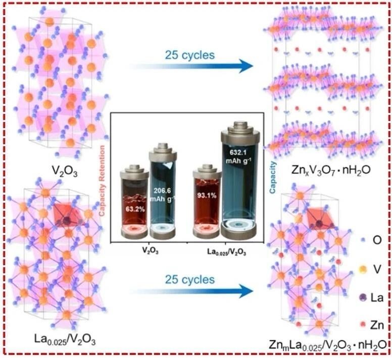 V2O3具有八面体隧道状的三维结构,有利于金属离子的快速嵌入与脱嵌,在水性锌离子电池中表现出较高的比容量。然而,其在循环过程中易发生相变,导致结构坍塌和容量衰减。本研究提出一种新型La3+掺杂策略,可有效抑制V2O3的不利相变,从而构建高性能、结构稳定的锌离子电池正极材料。引入的La3+离子不仅能够扩大晶格体积、拓宽离子传输通道,还可提供额外的Zn2+存储活性位点,并促进Zn2+扩散与电子传导。重要的是,La3+掺杂有助于维持V2O3的八面体隧道骨架结构,在反复充放电过程中抑制相变的发生,显著提升正极材料的循环稳定性。