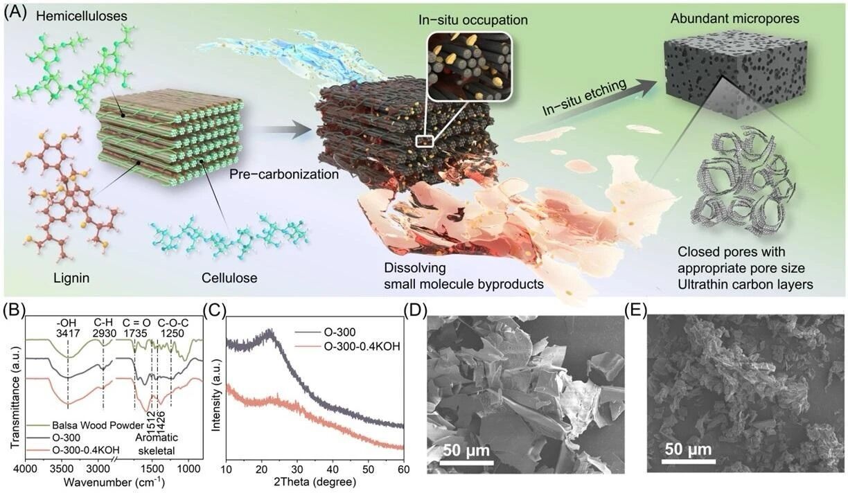 硬碳是钠电池中最具商业价值的负极材料,但其实际应用仍受限于低电压平台容量不足这一关键因素,该因素决定着电池的存储容量。本研究提出了一种有针对性的成分去除和化学蚀刻策略,以精确调整硬碳的多孔结构,从而显著提高平台容量。在该策略中,碱溶解的成分被去除,形成具有可调尺寸的封闭孔核心。随后,原位存在的碱通过化学蚀刻来塑造孔结构。优化后的硬碳材料不仅具有短程无序石墨域,以促进钠离子的嵌入和脱嵌,而且还具有丰富的微孔和适当孔径以及超薄碳层,显著增加钠的存储位点,进而大幅度提高了硬碳负极的低电压平台容量和首次库仑效率。重要的是,这种经济高效的方法在木质纤维素生物质中具有广泛的普适性,为设计用于钠电池的高性能碳质负极确立了一个通用模式。