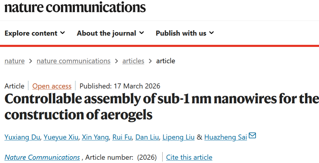 近日,我院赛华征教授团队在稀土基亚纳米线气凝胶可控构筑领域取得新突破,相关成果“Controllable assembly of sub-1 nm nanowires for the construction of aerogels”发表于综合性国际顶级期刊《Nature Communications》(DOI: 10.1038/s41467-026-70713-8)。赛华征教授为论文的独立通讯作者,硕士研究生杜玉祥为论文第一作者,太阳成tyc7111cc集团为唯一完成单位。