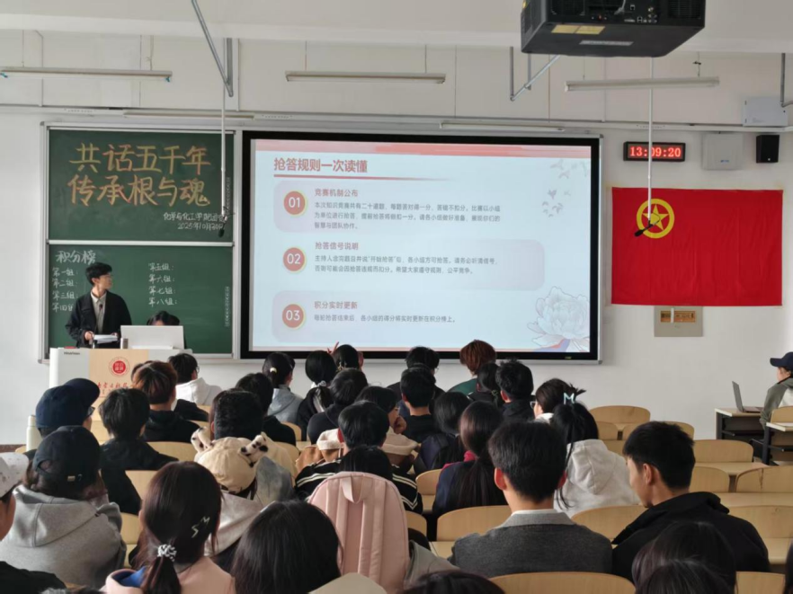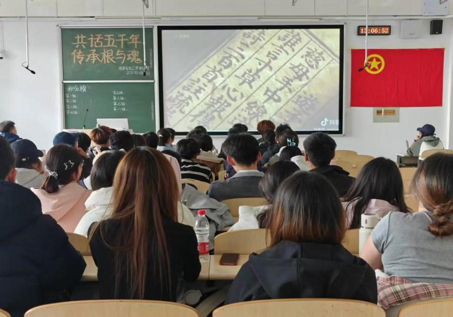 为深入学习贯彻习近平总书记关于传承发展中华优秀传统文化的重要论述精神,增强团员青年的历史自觉与文化自信,10月30日,我院团委在逸夫楼G202组织开展了“共话五千年传承根与魂”主题团日活动。活动通过多种形式的互动环节,引导同学们在参与中感受中华文明的深厚底蕴与绵延传承。
